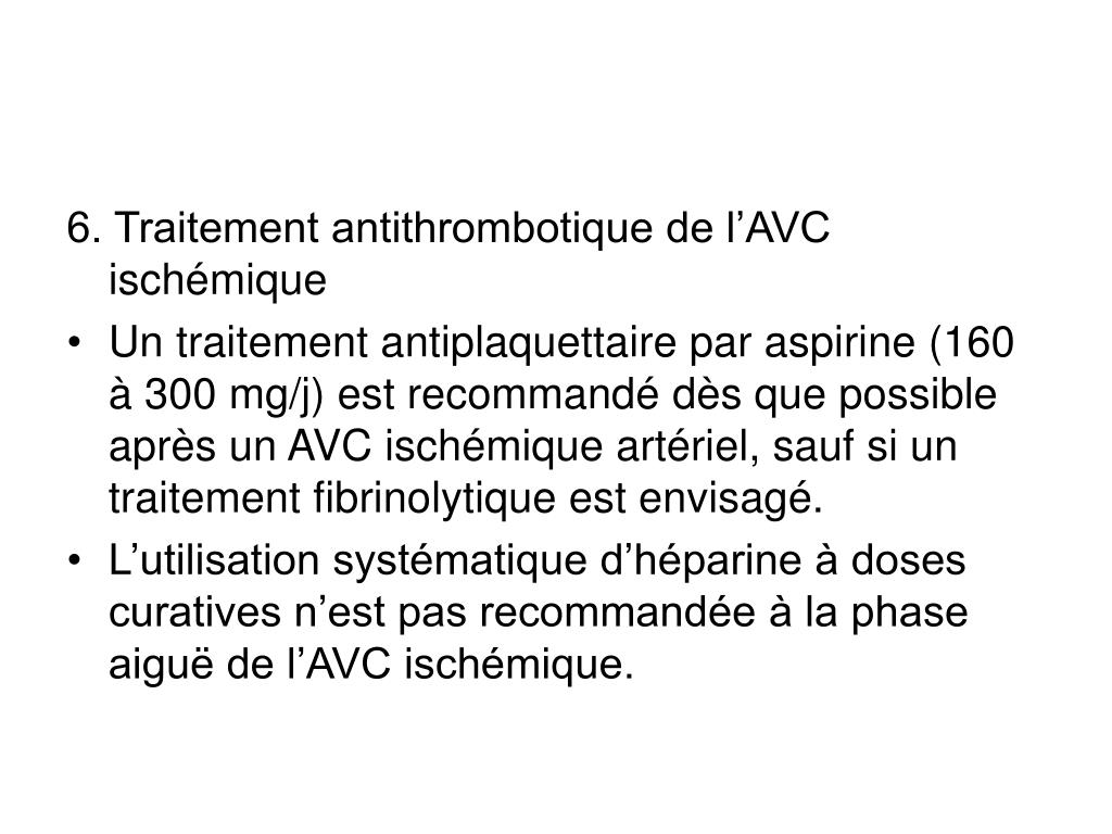 6. Traitement antithrombotique de l’AVC ischémique • Un traitement antiplaquettaire par aspirine (160 à 300 mg/j) est recommandé dès que possible après un AVC ischémique artériel, sauf si un traitement fibrinolytique est envisagé. • L’utilisation systématique d’héparine à doses curatives n’est pas recommandée à la phase aiguë de l’AVC ischémique.