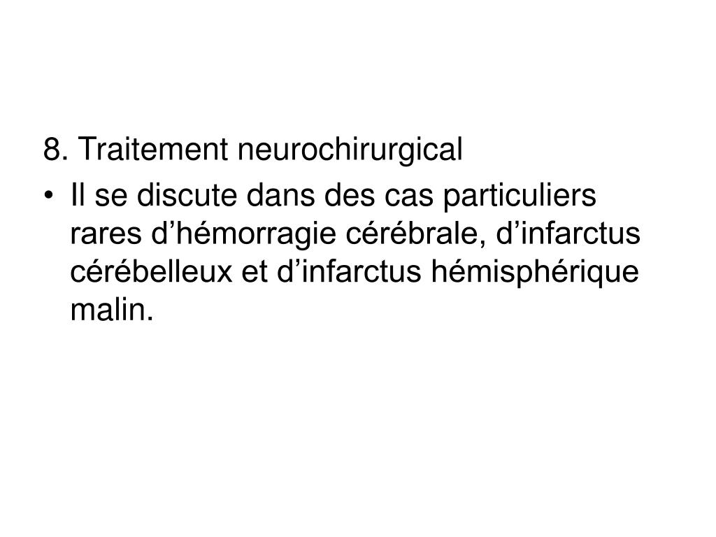 8. Traitement neurochirurgical • Il se discute dans des cas particuliers rares d’hémorragie cérébrale, d’infarctus cérébelleux et d’infarctus hémisphérique malin.