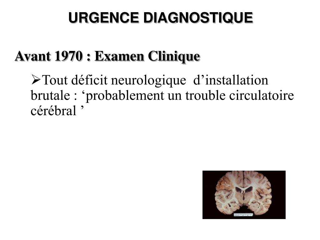 URGENCE DIAGNOSTIQUE Avant 1970 : Examen Clinique • Tout déficit neurologique d’installation brutale : ‘probablement un trouble circulatoire cérébral ’