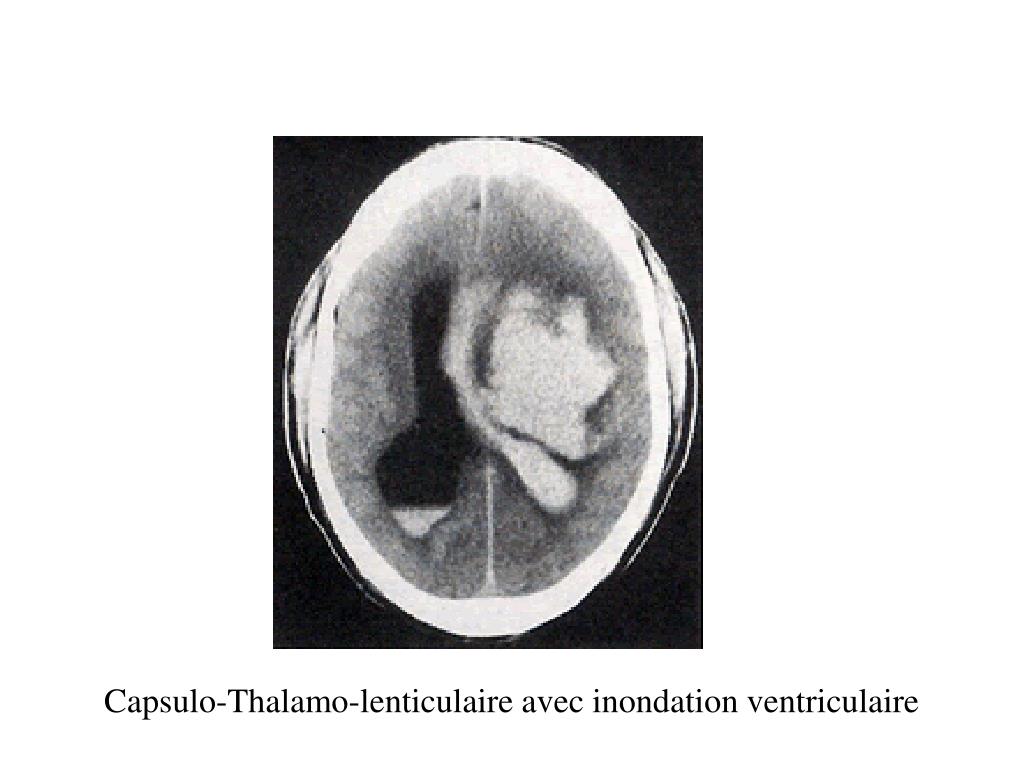 Hématome intra cérébral • fragilité vasculaire favorise la rupture. • La masse sanguine fuse dans le parenchyme, parfois le ventricule avec un risque d’HTIC et d’engagement.