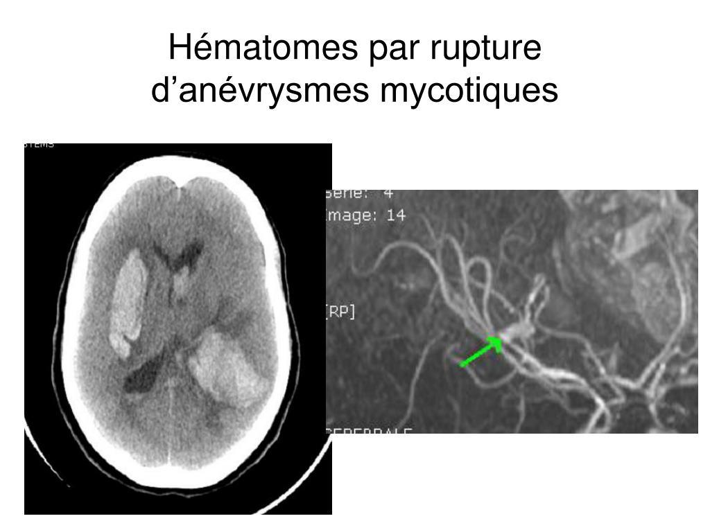 Hématomes par ruptured’anévrysme mycotique • Population : • contexte infectieux (température ) • endocardite fréquente (souffle cardiaque) • Mie de Osler • (toxico, immunodépression...) • Fréquence : rarissime • Localisation : • en fin d’arbre artériel (svt sylvien) • territoire jonctionnel (svt carrefour) • cortico-sous-corticale (superficiel) • ± Hémorragie méningée