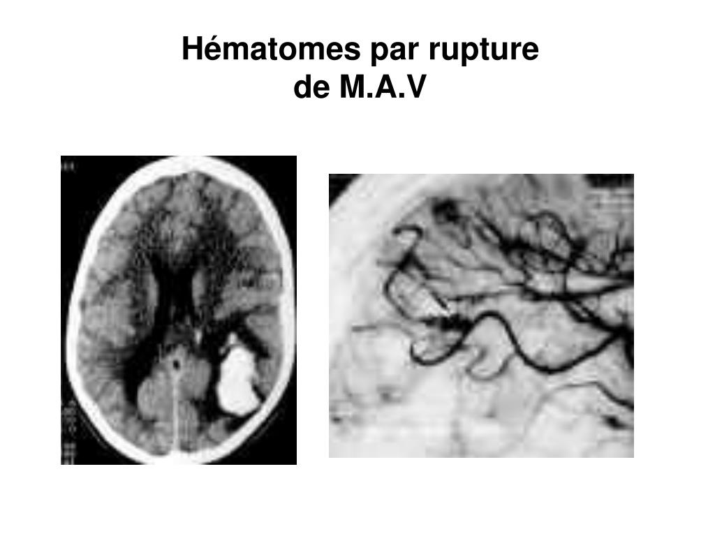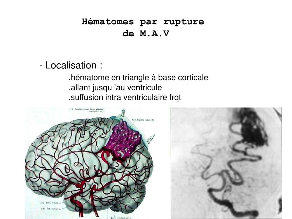 Hématomes par rupture de M.A.V - Localisation : .hématome en triangle à base corticale .allant jusqu ’au ventricule .suffusion intra ventriculaire frqt