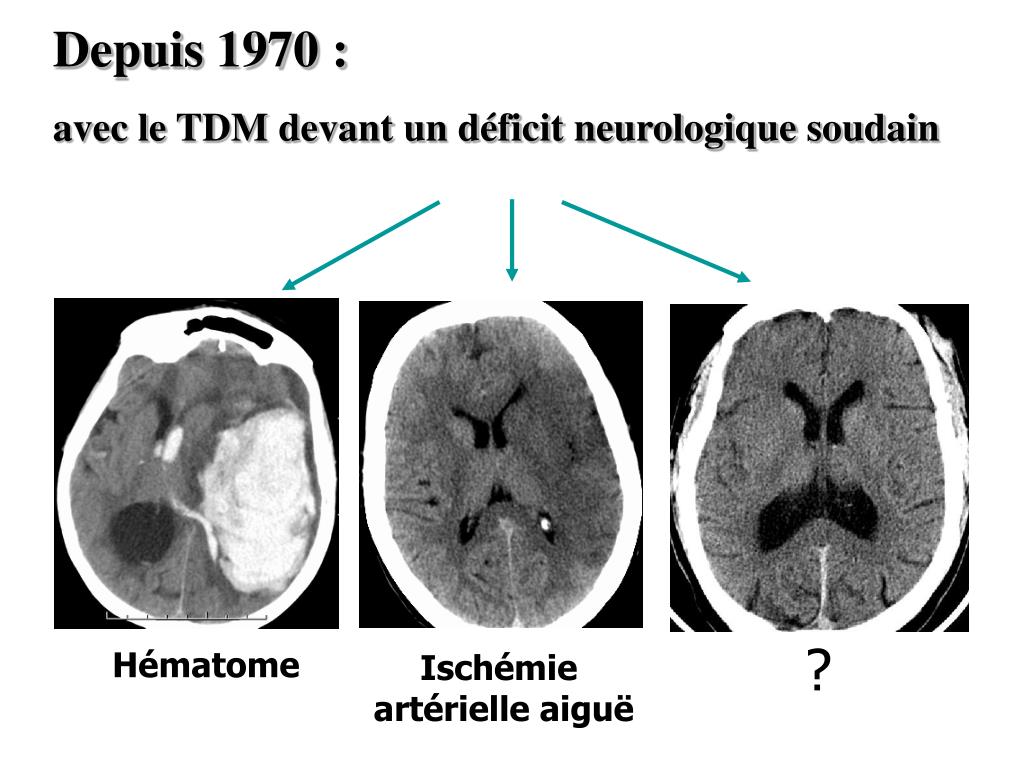 Depuis 1970 : avec le TDM devant un déficit neurologique soudain ? Hématome Ischémie artérielle aiguë
