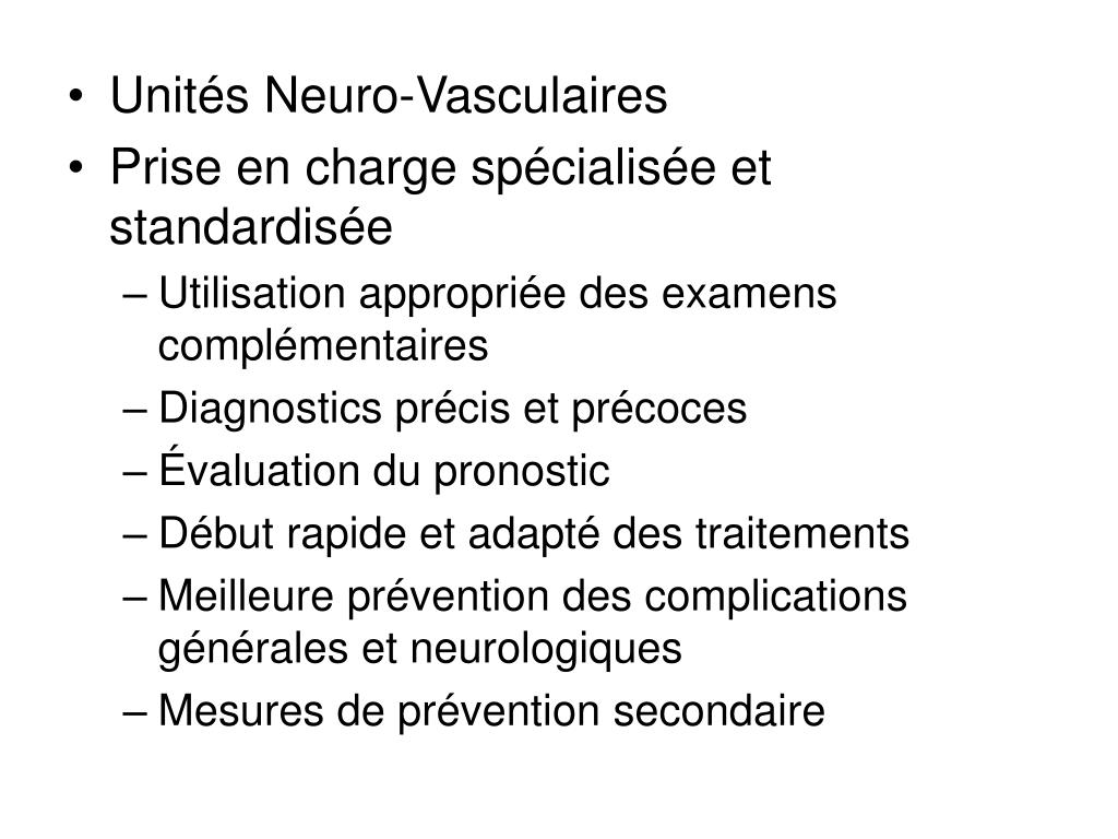Unités Neuro-Vasculaires • Prise en charge spécialisée et standardisée • Utilisation appropriée des examens complémentaires • Diagnostics précis et précoces • Évaluation du pronostic • Début rapide et adapté des traitements • Meilleure prévention des complications générales et neurologiques • Mesures de prévention secondaire