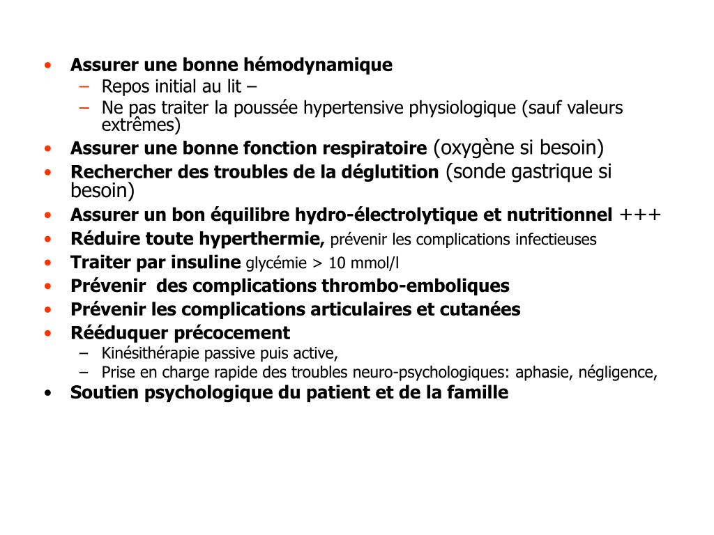 Assurer une bonne hémodynamique • Repos initial au lit – • Ne pas traiter la poussée hypertensive physiologique (sauf valeurs extrêmes) • Assurer une bonne fonction respiratoire (oxygène si besoin) • Rechercher des troubles de la déglutition (sonde gastrique si besoin) • Assurer un bon équilibre hydro-électrolytique et nutritionnel +++ • Réduire toute hyperthermie, prévenir les complications infectieuses • Traiter par insuline glycémie > 10 mmol/l • Prévenir des complications thrombo-emboliques • Prévenir les complications articulaires et cutanées • Rééduquer précocement • Kinésithérapie passive puis active, • Prise en charge rapide des troubles neuro-psychologiques: aphasie, négligence, • Soutien psychologique du patient et de la famille