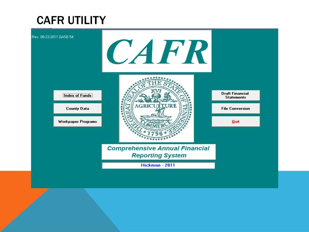 CAFR Utility • Data background • File layout format • Excel macros VBA • Utilities Purpose