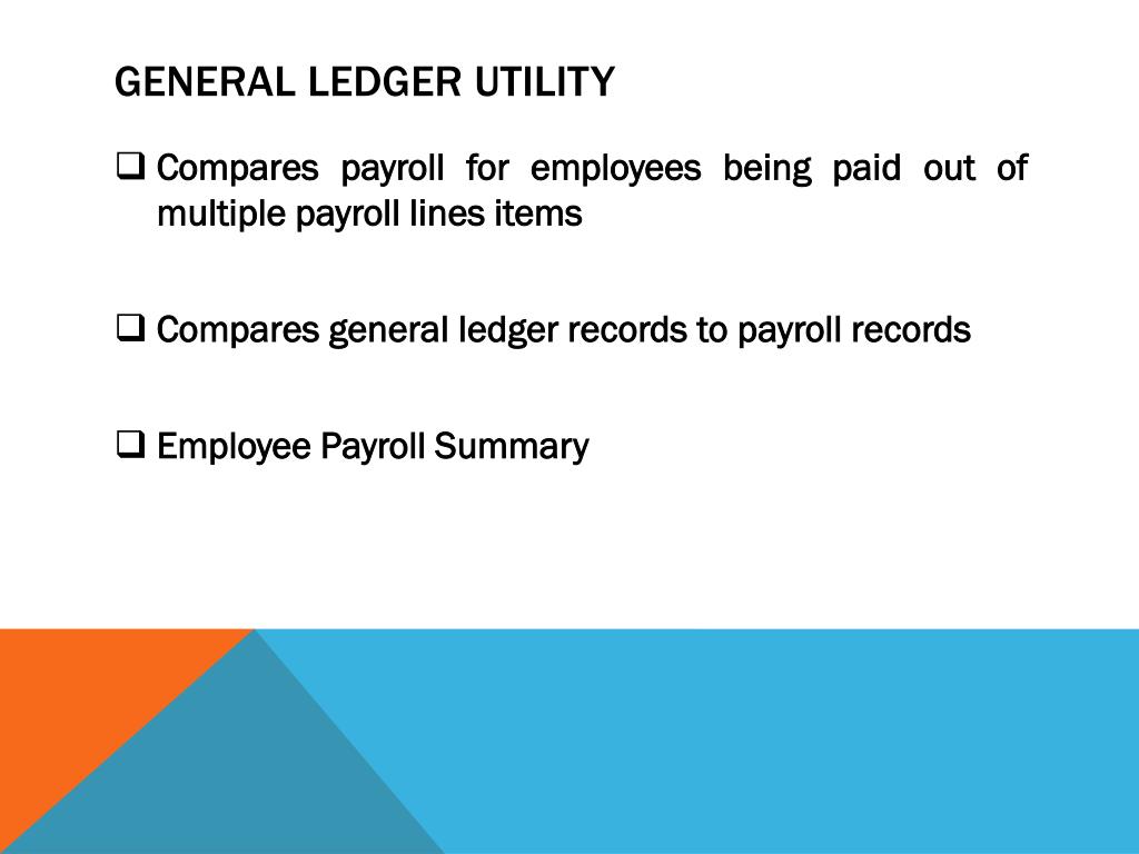 General Ledger Utility • Compares payroll for employees being paid out of multiple payroll lines items • Compares general ledger records to payroll records • Employee Payroll Summary