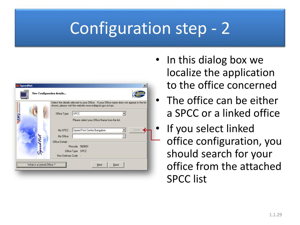 Configuration step - 2 • In this dialog box we localize the application to the office concerned • The office can be either a SPCC or a linked office • If you select linked office configuration, you should search for your office from the attached SPCC list