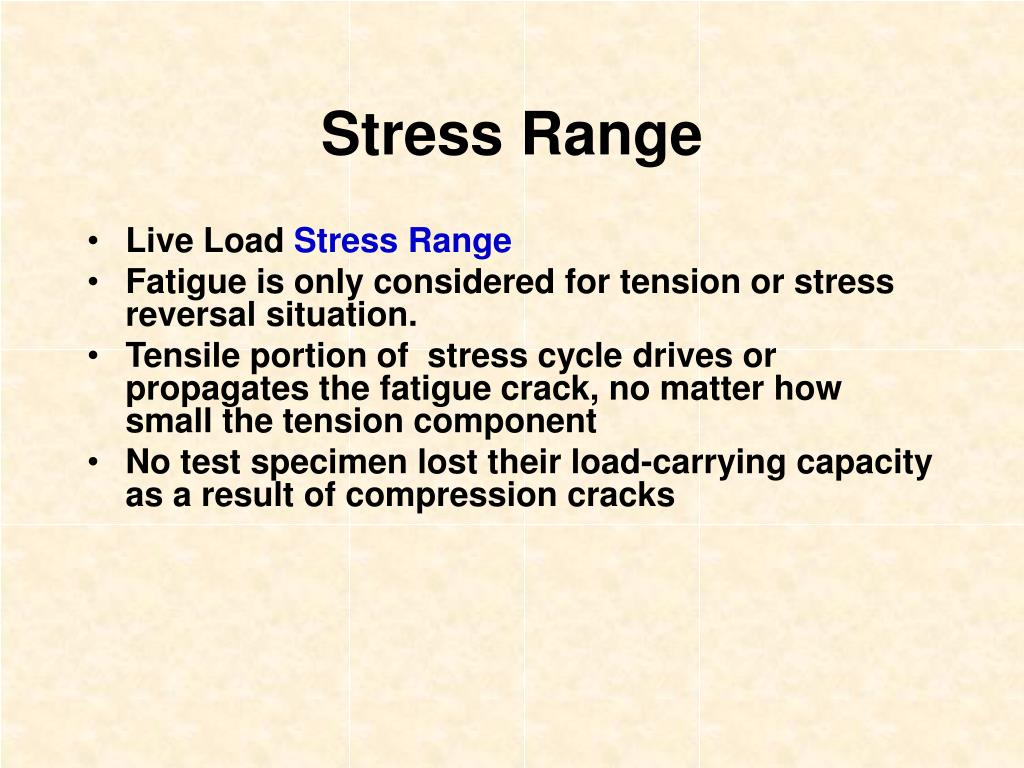Stress Range • Live Load Stress Range • Fatigue is only considered for tension or stress reversal situation. • Tensile portion of stress cycle drives or propagates the fatigue crack, no matter how small the tension component • No test specimen lost their load-carrying capacity as a result of compression cracks