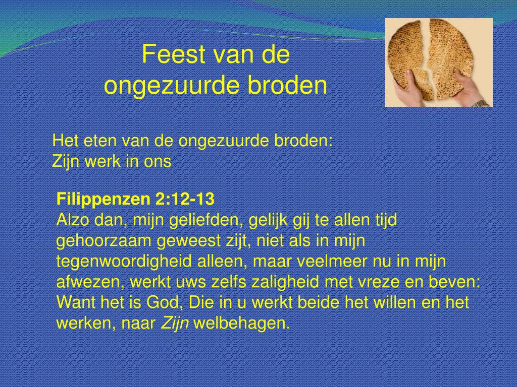 Feest van de ongezuurde broden Het eten van de ongezuurde broden:Zijn werk in ons Filippenzen 2:12-13Alzo dan, mijn geliefden, gelijk gij te allen tijd gehoorzaam geweest zijt, niet als in mijn tegenwoordigheid alleen, maar veelmeer nu in mijn afwezen, werkt uws zelfs zaligheid met vreze en beven: Want het is God, Die in u werkt beide het willen en het werken, naar Zijn welbehagen.