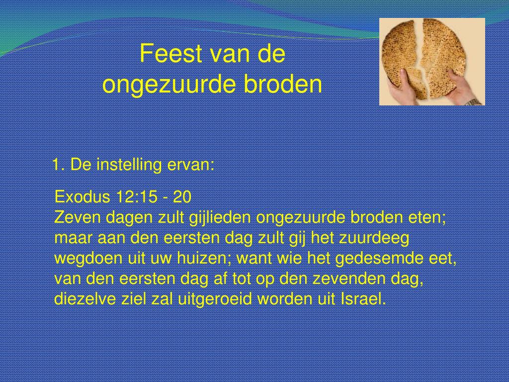 Feest van de ongezuurde broden 1. De instelling ervan: Exodus 12:15 - 20Zo onderhoudt dan de ongezuurde broden, dewijl Ik even aan denzelfden dag ulieder heiren uit Egypteland geleid zal hebben; daarom zult gij dezen dag houden, onder uw geslachten, tot een eeuwige inzetting. In de eerste maand, aan den veertienden dag der maand, in den avond, zult gij ongezuurde broden eten, tot den een en twintigsten dag der maand, in den avond.