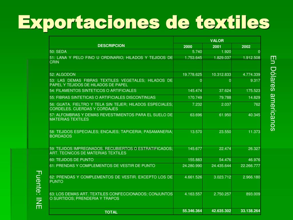 Exportaciones de textiles En Dólares americanos Fuente: INE