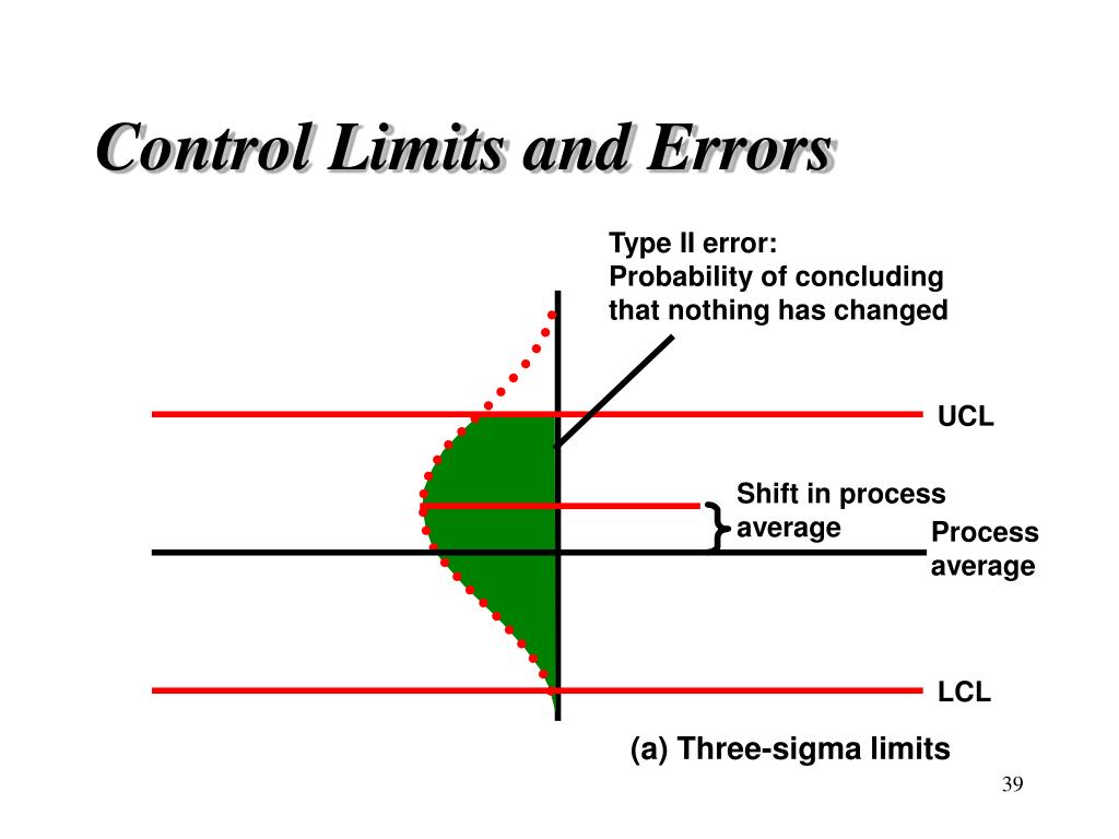 Control Limits and Errors Type II error: Probability of concluding that nothing has changed UCL Shift in process average Process average LCL (a) Three-sigma limits
