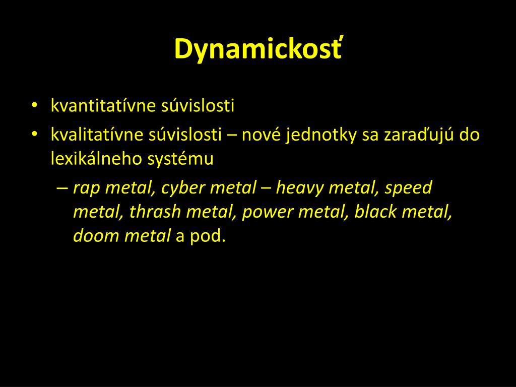 Dynamickosť • kvantitatívne súvislosti • kvalitatívne súvislosti – nové jednotky sa zaraďujú do lexikálneho systému • rap metal, cyber metal – heavy metal, speed metal, thrash metal, power metal, black metal, doom metal a pod.