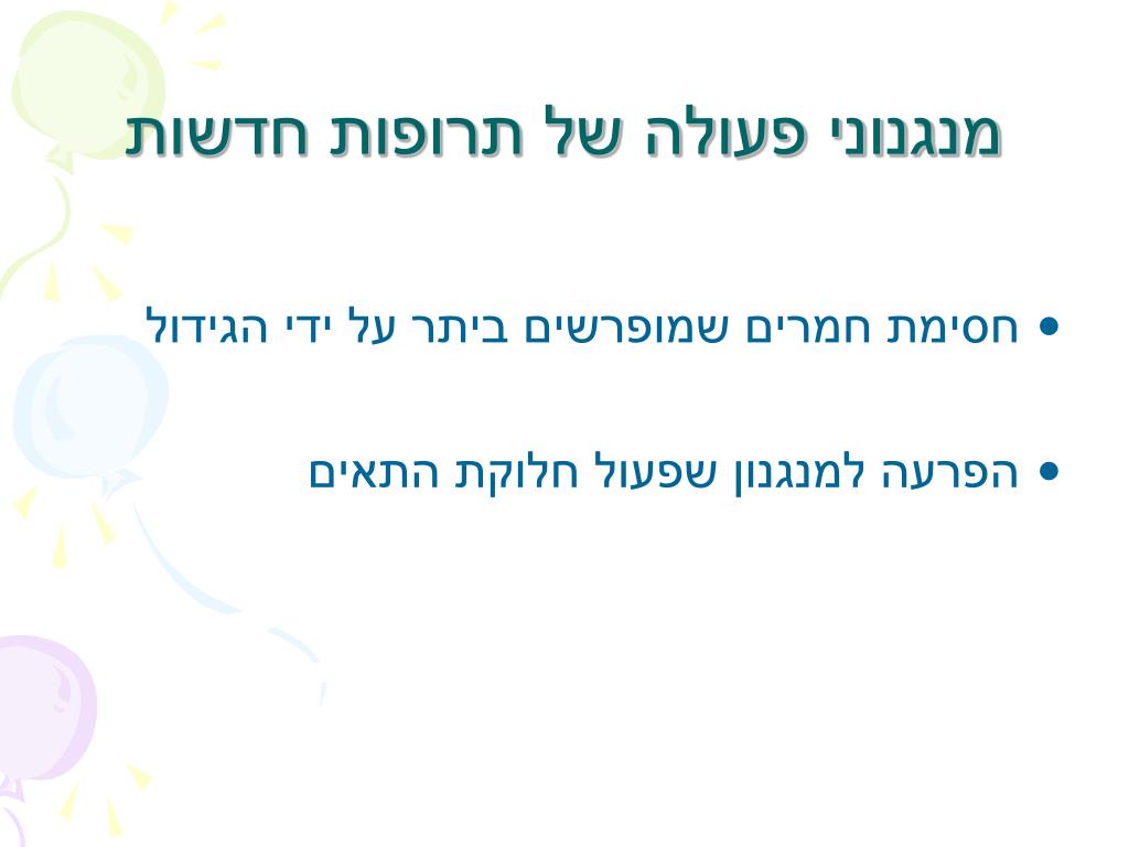 מנגנוני פעולה של תרופות חדשות • חסימת חמרים שמופרשים ביתר על ידי הגידול • הפרעה למנגנון שפעול חלוקת התאים