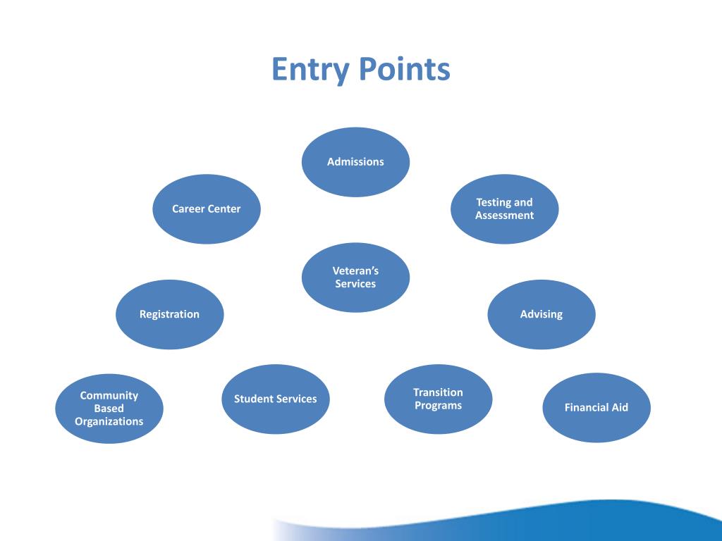 Entry Points Admissions Career Center Testing and Assessment Veteran’s Services Registration Advising Financial Aid Community Based Organizations Student Services Transition Programs