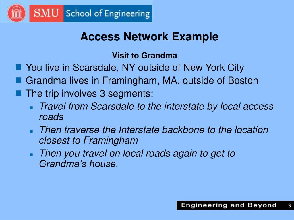 Access Network Example Visit to Grandma • You live in Scarsdale, NY outside of New York City • Grandma lives in Framingham, MA, outside of Boston • The trip involves 3 segments: • Travel from Scarsdale to the interstate by local access roads • Then traverse the Interstate backbone to the location closest to Framingham • Then you travel on local roads again to get to Grandma’s house.
