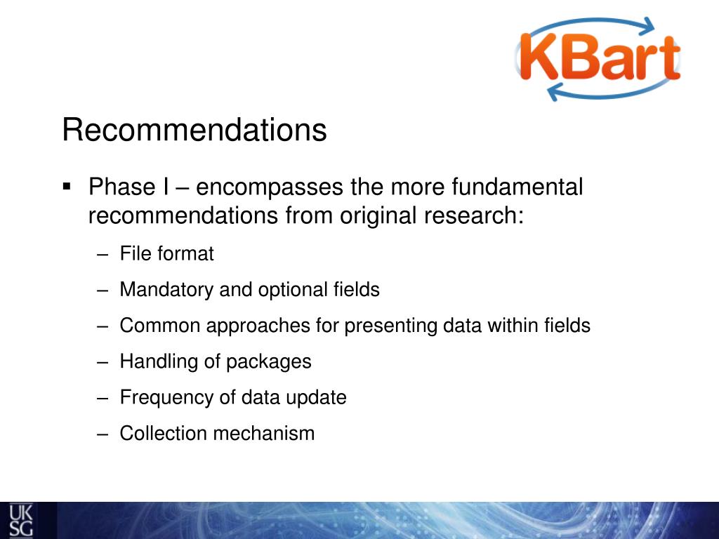 Right. So. What is KBART? • Knowledge Bases And Related Tools • UKSG and NISO collaborative project • To improve navigation of the e-resource supply chain by • Ensuring timely transfer of accurate data to knowledge bases, ERMs etc.