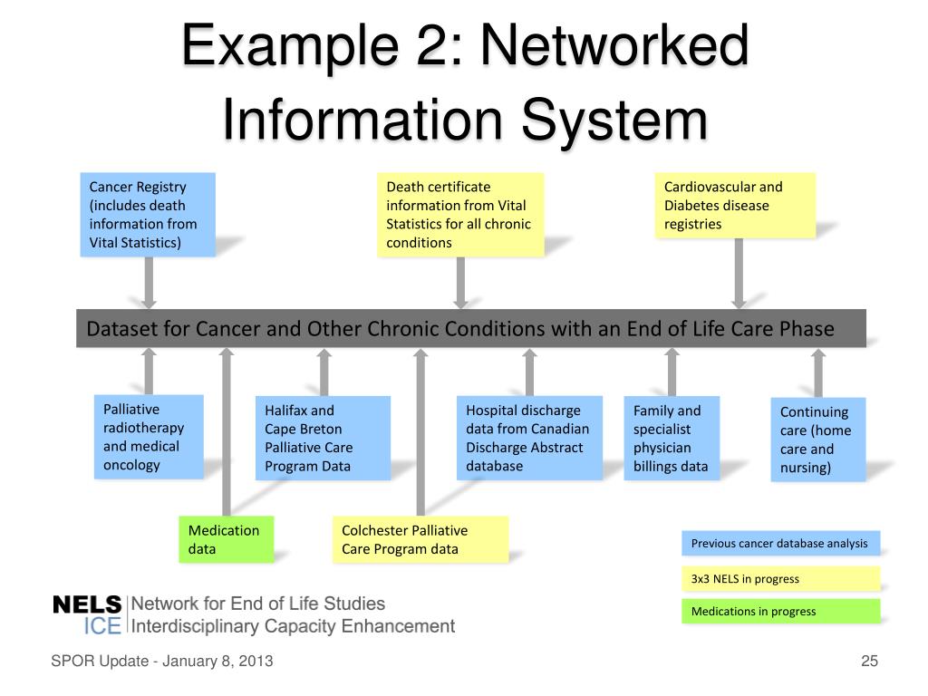 Example 2: Networked Information System Cancer Registry (includes death information from Vital Statistics) Death certificate information from Vital Statistics for all chronic conditions Cardiovascular and Diabetes disease registries Dataset for Cancer and Other Chronic Conditions with an End of Life Care Phase Palliative radiotherapy and medical oncology Hospital discharge data from Canadian Discharge Abstract database Halifax and Cape Breton Palliative Care Program Data Family and specialist physician billings data Continuing care (home care and nursing) Colchester Palliative Care Program data Medication data Previous cancer database analysis 3x3 NELS in progress Medications in progress SPOR Update - January 8, 2013