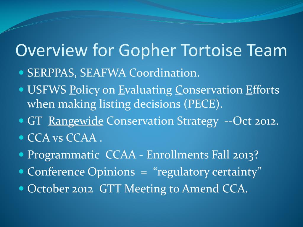 Overview for Gopher Tortoise Team • SERPPAS, SEAFWA Coordination. • USFWS Policy on Evaluating Conservation Efforts when making listing decisions (PECE). • GT Rangewide Conservation Strategy --Oct 2012. • CCA vs CCAA . • Programmatic CCAA - Enrollments Fall 2013? • Conference Opinions = “regulatory certainty” • October 2012 GTT Meeting to Amend CCA.