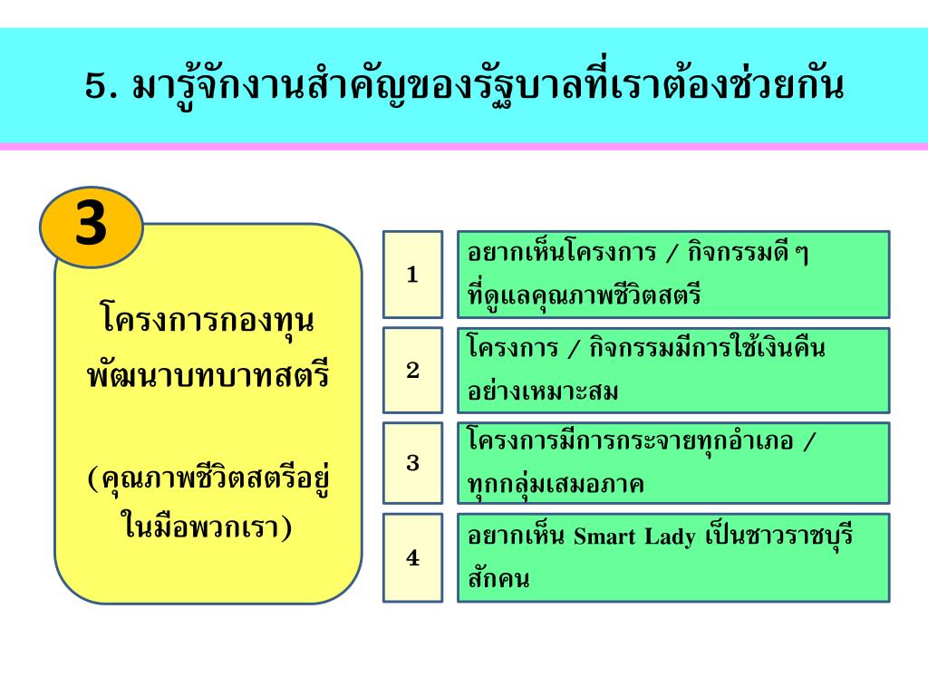 5. มารู้จักงานสำคัญของรัฐบาลที่เราต้องช่วยกัน 3 โครงการกองทุนพัฒนาบทบาทสตรี (คุณภาพชีวิตสตรีอยู่ในมือพวกเรา) 1 อยากเห็นโครงการ / กิจกรรมดีๆ ที่ดูแลคุณภาพชีวิตสตรี 2 โครงการ / กิจกรรมมีการใช้เงินคืนอย่างเหมาะสม 3 โครงการมีการกระจายทุกอำเภอ / ทุกกลุ่มเสมอภาค 4 อยากเห็น Smart Lady เป็นชาวราชบุรีสักคน