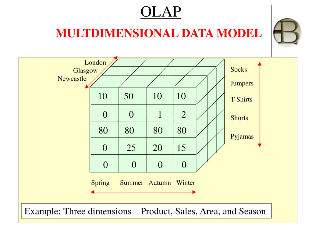 OLAP MULTDIMENSIONAL DATA MODEL London Socks Glasgow Newcastle Jumpers 10 50 10 10 T-Shirts 0 0 1 2 Shorts 80 80 80 80 Pyjamas 0 25 20 15 0 0 0 0 Spring Summer Autumn Winter Example: Three dimensions – Product, Sales, Area, and Season By: Babu Ram Dawadi