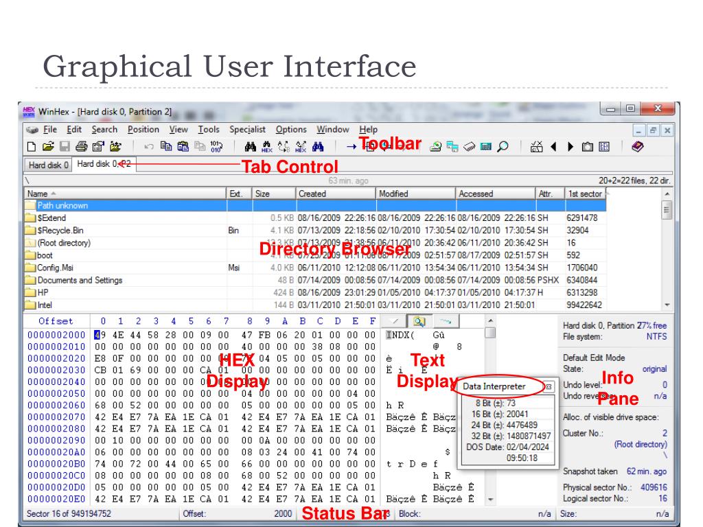 Intro to WinHex. CSC 414. Graphical User Interface . Toolbar. Tab Control. Directory Browser. HEX Display. Text Display. Info Pane. Status Bar. Opening a disk.