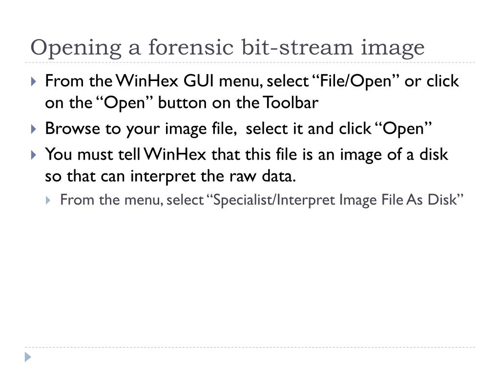 Opening a forensic bit-stream image • From the WinHexGUI menu, select “File/Open” or click on the “Open” button on the Toolbar • Browse to your image file, select it and click “Open” • You must tell WinHex that this file is an image of a disk so that can interpret the raw data. • From the menu, select “Specialist/Interpret Image File As Disk”