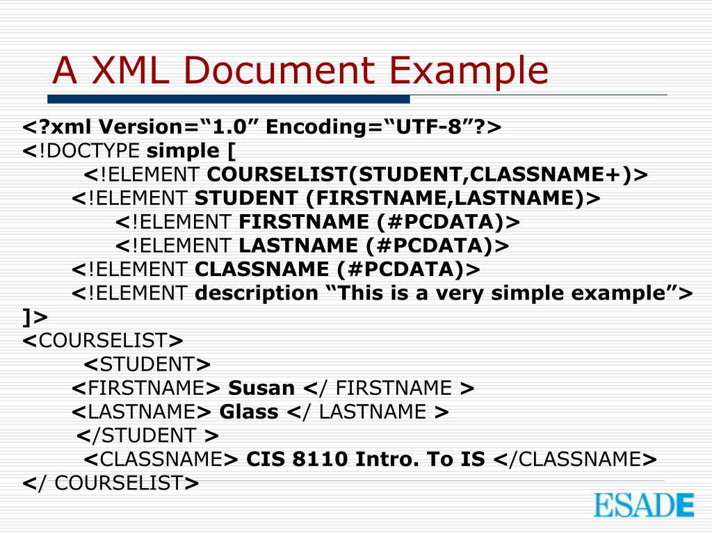 A XML Document Example <?xml Version=“1.0” Encoding=“UTF-8”?> <!DOCTYPE simple [ <!ELEMENT COURSELIST(STUDENT,CLASSNAME+)> <!ELEMENT STUDENT (FIRSTNAME,LASTNAME)> <!ELEMENT FIRSTNAME (#PCDATA)> <!ELEMENT LASTNAME (#PCDATA)> <!ELEMENT CLASSNAME (#PCDATA)> <!ELEMENT description “This is a very simple example”> ]> <COURSELIST> <STUDENT> <FIRSTNAME> Susan </ FIRSTNAME > <LASTNAME> Glass </ LASTNAME > </STUDENT > <CLASSNAME> CIS 8110 Intro. To IS </CLASSNAME> </ COURSELIST>