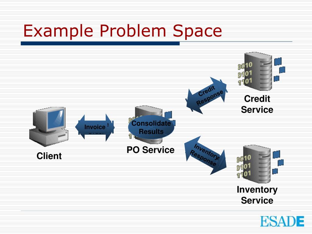 CreditResponse InventoryResponse CreditCheck Purchase Order ReserveInventory Invoice Example Problem Space Credit Service Consolidate Results PO Service Client Inventory Service