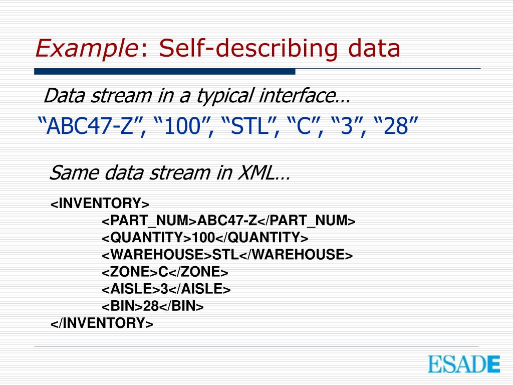 Data stream in a typical interface… “ABC47-Z”, “100”, “STL”, “C”, “3”, “28” Same data stream in XML… <INVENTORY> <PART_NUM>ABC47-Z</PART_NUM> <QUANTITY>100</QUANTITY> <WAREHOUSE>STL</WAREHOUSE> <ZONE>C</ZONE> <AISLE>3</AISLE> <BIN>28</BIN> </INVENTORY> Example: Self-describing data