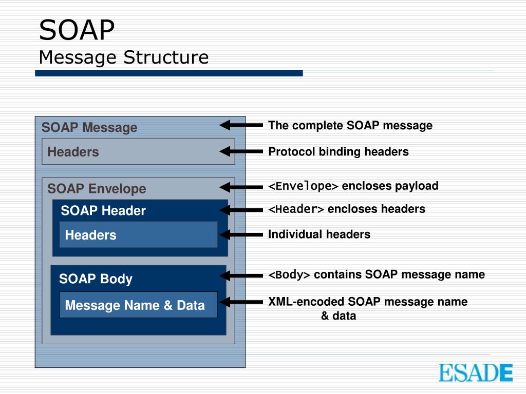 SOAPMessage Structure The complete SOAP message SOAP Message Protocol binding headers Headers <Envelope> encloses payload SOAP Envelope <Header> encloses headers SOAP Header Individual headers Headers <Body> contains SOAP message name SOAP Body Message Name & Data XML-encoded SOAP message name & data