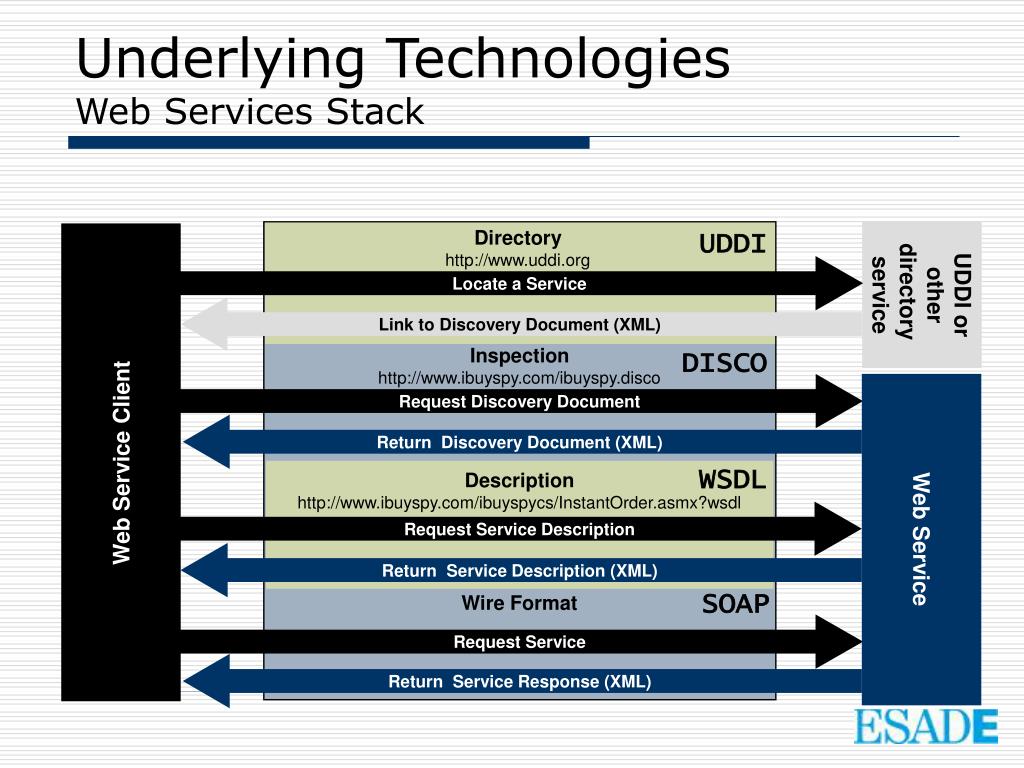 Underlying TechnologiesWeb Services Stack Directory: Publish & Find Services: UDDI Inspection: Find Services on server: DISCO Description: Formal Service Descriptions: WSDL Wire Format: Service Interactions: SOAP Universal Data Format: XML Ubiquitous Communications: Internet Simple, Open, Broad Industry Support