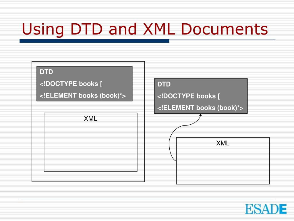 Using DTD and XML Documents DTD <!DOCTYPE books [ <!ELEMENT books (book)*> DTD <!DOCTYPE books [ <!ELEMENT books (book)*> XML XML