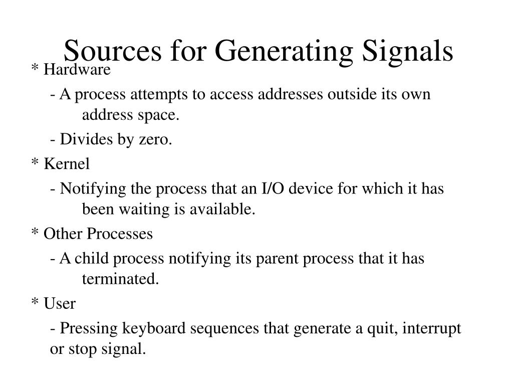 Sources for Generating Signals * Hardware - A process attempts to access addresses outside its own address space. - Divides by zero. * Kernel - Notifying the process that an I/O device for which it has been waiting is available. * Other Processes - A child process notifying its parent process that it has terminated. * User - Pressing keyboard sequences that generate a quit, interrupt or stop signal.