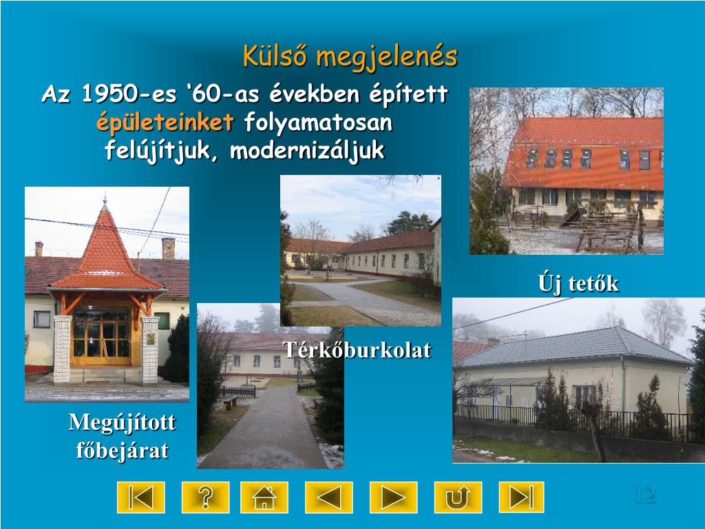 Külső megjelenés Az 1950-es ‘60-as években épített épületeinket folyamatosan felújítjuk, modernizáljuk Új tetők Térkőburkolat Megújított főbejárat