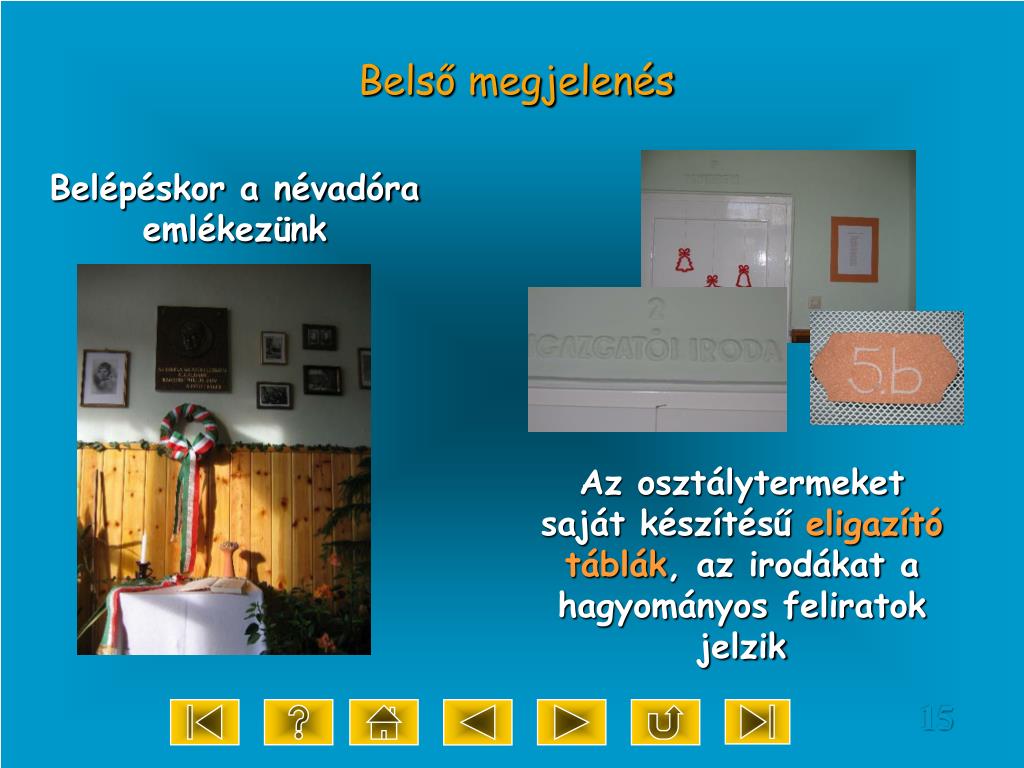 Belső megjelenés Belépéskor a névadóra emlékezünk Az osztálytermeket saját készítésű eligazító táblák, az irodákat a hagyományos feliratok jelzik