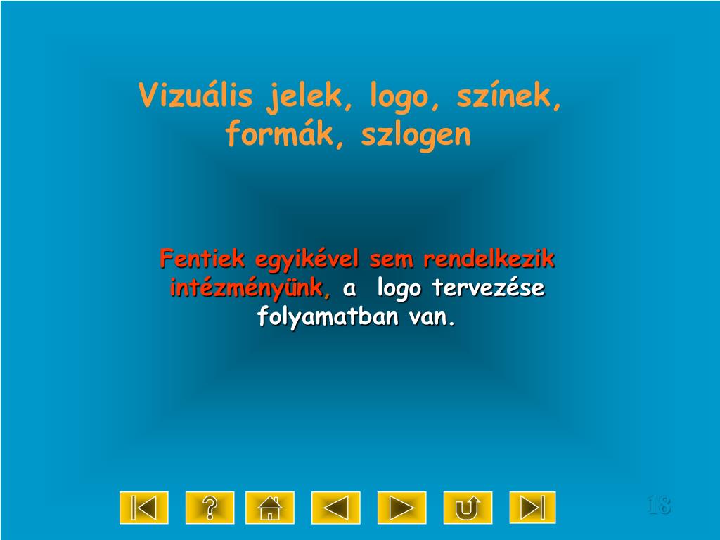 Vizuális jelek, logo, színek, formák, szlogen Fentiek egyikével sem rendelkezik intézményünk, a logo tervezése folyamatban van.