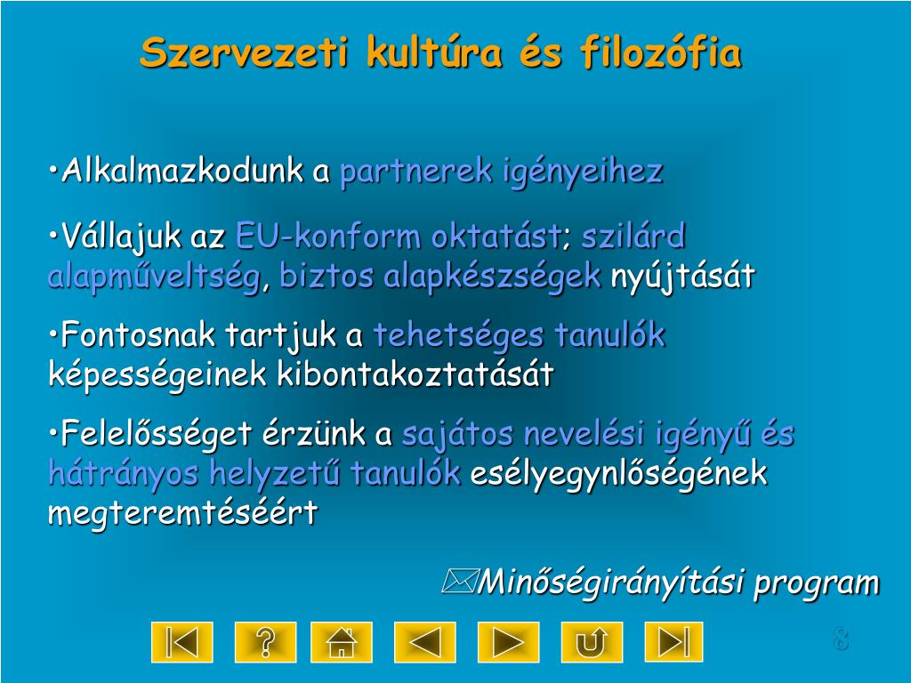 Szervezeti kultúra és filozófia Alkalmazkodunk a partnerek igényeihez Vállajuk az EU-konform oktatást; szilárd alapműveltség, biztos alapkészségek nyújtását Fontosnak tartjuk a tehetséges tanulók képességeinek kibontakoztatását Felelősséget érzünk a sajátos nevelési igényű és hátrányos helyzetű tanulók esélyegynlőségének megteremtéséért Minőségirányítási program