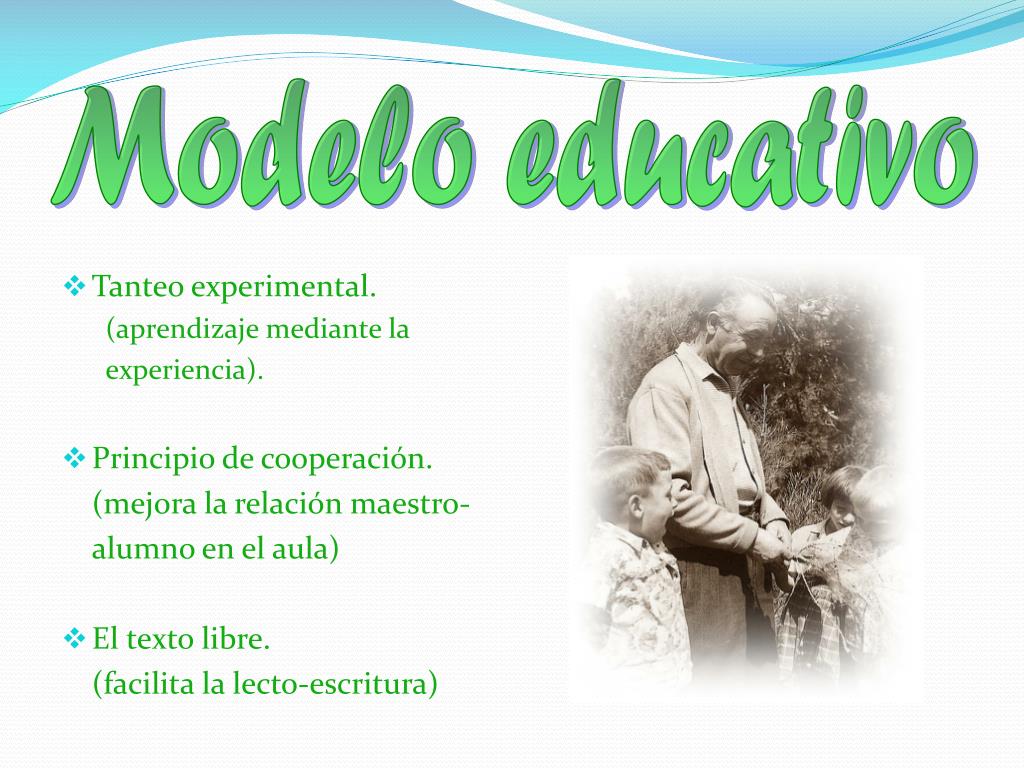 Modelo educativo • Tanteo experimental. (aprendizaje mediante la experiencia). • Principio de cooperación. (mejora la relación maestro- alumno en el aula) • El texto libre. (facilita la lecto-escritura)