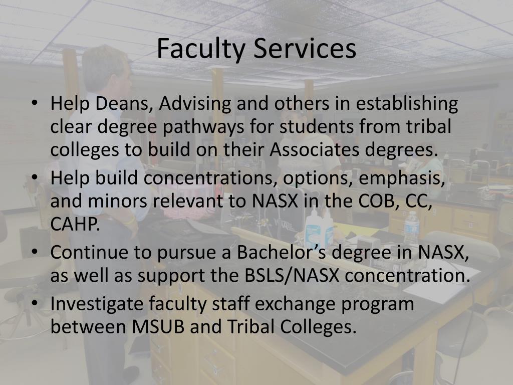 Faculty Services • Help Deans, Advising and others in establishing clear degree pathways for students from tribal colleges to build on their Associates degrees. • Help build concentrations, options, emphasis, and minors relevant to NASX in the COB, CC, CAHP. • Continue to pursue a Bachelor’s degree in NASX, as well as support the BSLS/NASX concentration. • Investigate faculty staff exchange program between MSUB and Tribal Colleges.