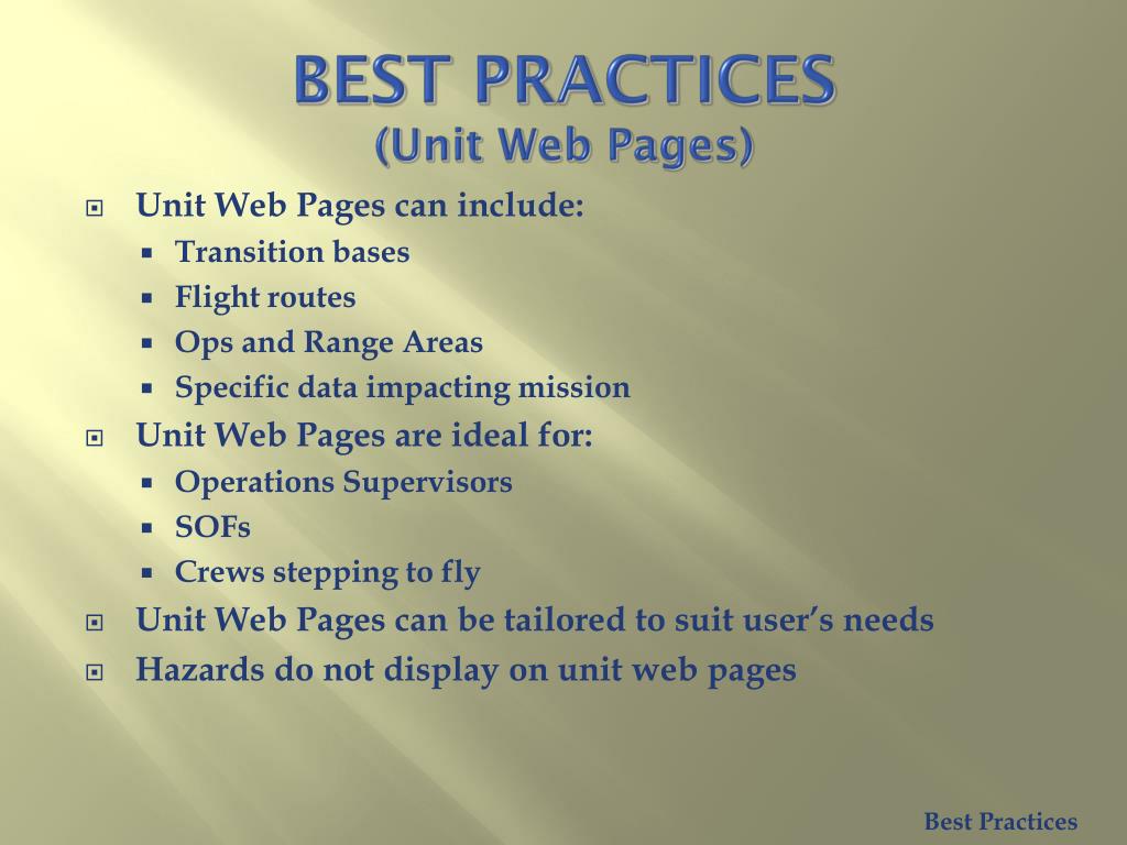 BEST PRACTICES(Unit Web Pages) • Unit Web Pages can include: • Transition bases • Flight routes • Ops and Range Areas • Specific data impacting mission • Unit Web Pages are ideal for: • Operations Supervisors • SOFs • Crews stepping to fly • Unit Web Pages can be tailored to suit user’s needs • Hazards do not display on unit web pages Best Practices