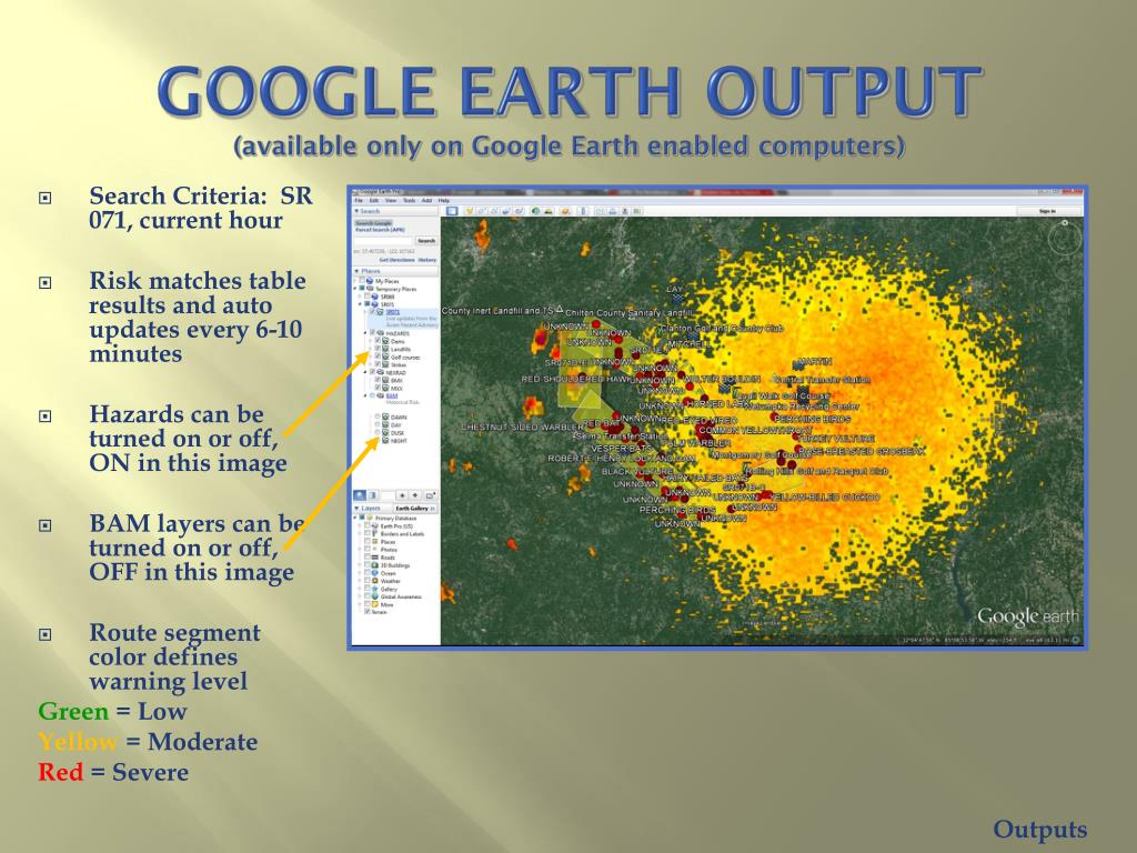 GOOGLE EARTH OUTPUT(available only on Google Earth enabled computers) • Search Criteria: SR 071, current hour • Risk matches table results and auto updates every 6-10 minutes • Hazards can be turned on or off, ON in this image • BAM layers can be turned on or off, OFF in this image • Route segment color defines warning level Green = Low Yellow= Moderate Red= Severe Outputs