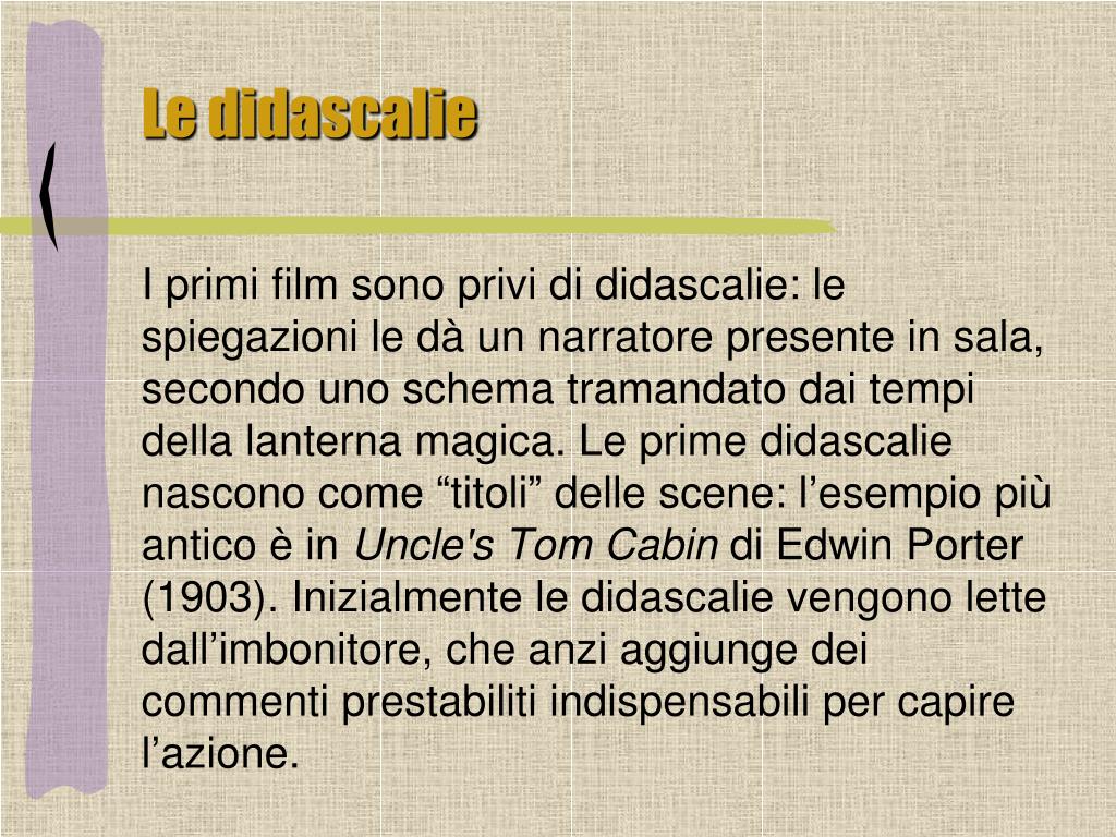 Le didascalie • I primi film sono privi di didascalie: le spiegazioni le dà un narratore presente in sala, secondo uno schema tramandato dai tempi della lanterna magica. Le prime didascalie nascono come “titoli” delle scene: l’esempio più antico è in Uncle's Tom Cabin di Edwin Porter (1903). Inizialmente le didascalie vengono lette dall’imbonitore, che anzi aggiunge dei commenti prestabiliti indispensabili per capire l’azione.