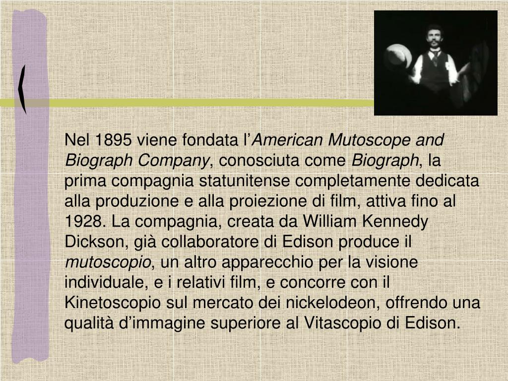 Nel 1895 viene fondata l’American Mutoscope and Biograph Company, conosciuta come Biograph, la prima compagnia statunitense completamente dedicata alla produzione e alla proiezione di film, attiva fino al 1928. La compagnia, creata da William Kennedy Dickson, già collaboratore di Edison produce il mutoscopio, un altro apparecchio per la visione individuale, e i relativi film, e concorre con il Kinetoscopio sul mercato dei nickelodeon, offrendo una qualità d’immagine superiore al Vitascopio di Edison.