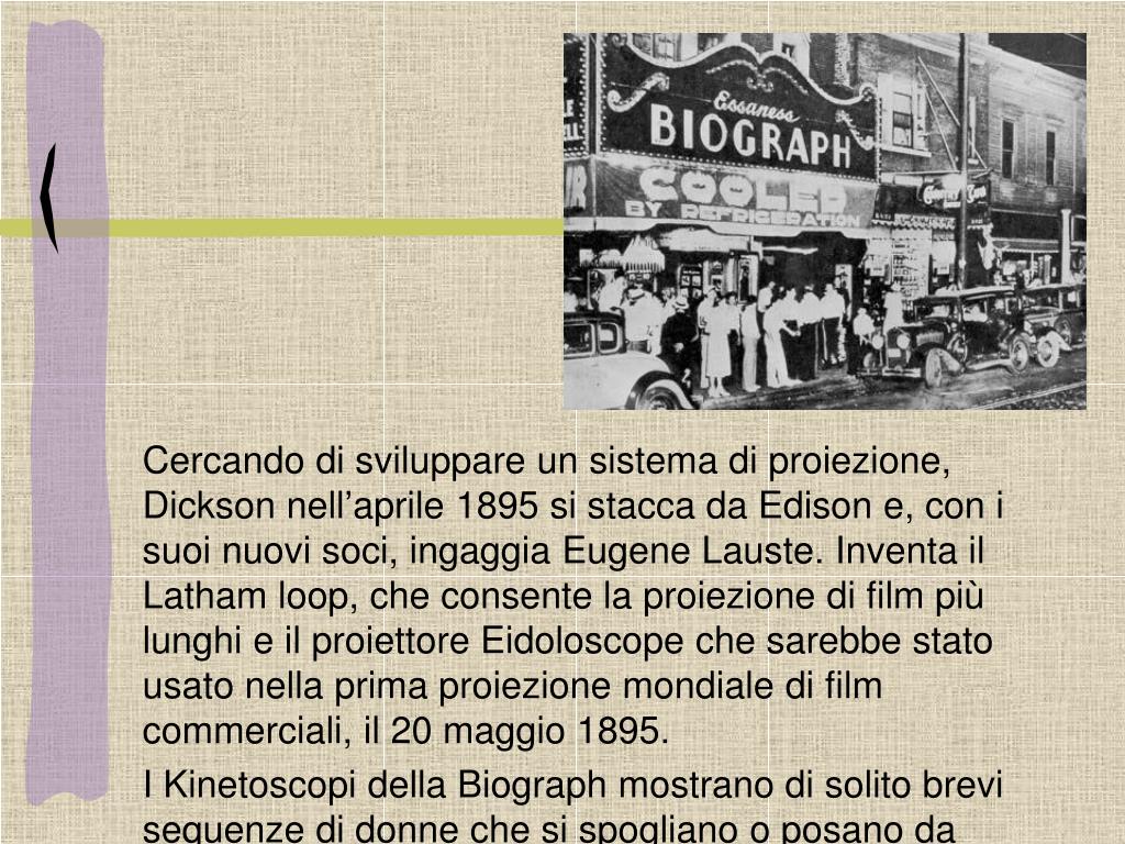 Cercando di sviluppare un sistema di proiezione, Dickson nell’aprile 1895 si stacca da Edison e, con i suoi nuovi soci, ingaggia Eugene Lauste. Inventa il Latham loop, che consente la proiezione di film più lunghi e il proiettore Eidoloscope che sarebbe stato usato nella prima proiezione mondiale di film commerciali, il 20 maggio 1895. • I Kinetoscopi della Biograph mostrano di solito brevi sequenze di donne che si spogliano o posano da modelle. In Gran Bretagna diventano presto le macchine “ciò che vede il maggiordomo”, usando il nome di uno dei primi e più famosi filmati softcore.