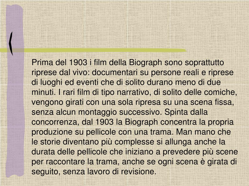 Prima del 1903 i film della Biograph sono soprattutto riprese dal vivo: documentari su persone reali e riprese di luoghi ed eventi che di solito durano meno di due minuti. I rari film di tipo narrativo, di solito delle comiche, vengono girati con una sola ripresa su una scena fissa, senza alcun montaggio successivo. Spinta dalla concorrenza, dal 1903 la Biograph concentra la propria produzione su pellicole con una trama. Man mano che le storie diventano più complesse si allunga anche la durata delle pellicole che iniziano a prevedere più scene per raccontare la trama, anche se ogni scena è girata di seguito, senza lavoro di revisione.