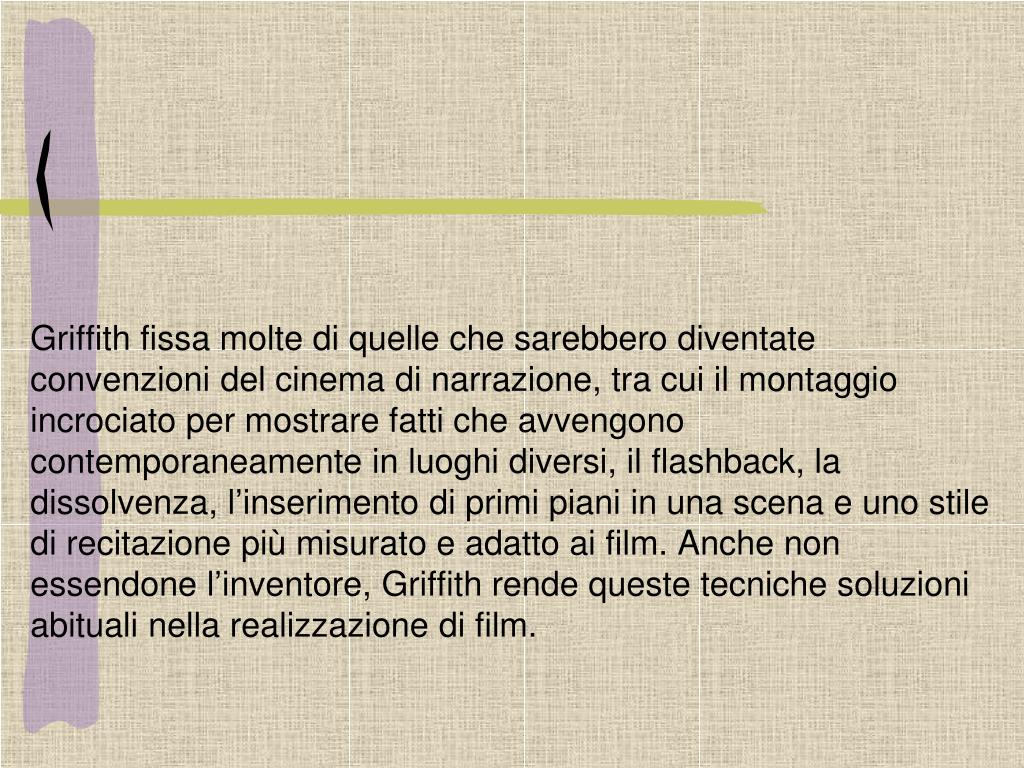 Griffith fissa molte di quelle che sarebbero diventate convenzioni del cinema di narrazione, tra cui il montaggio incrociato per mostrare fatti che avvengono contemporaneamente in luoghi diversi, il flashback, la dissolvenza, l’inserimento di primi piani in una scena e uno stile di recitazione più misurato e adatto ai film. Anche non essendone l’inventore, Griffith rende queste tecniche soluzioni abituali nella realizzazione di film.