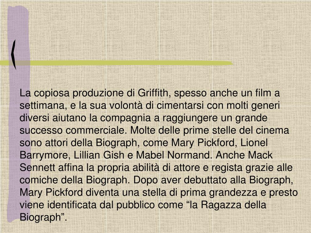 La copiosa produzione di Griffith, spesso anche un film a settimana, e la sua volontà di cimentarsi con molti generi diversi aiutano la compagnia a raggiungere un grande successo commerciale. Molte delle prime stelle del cinema sono attori della Biograph, come Mary Pickford, Lionel Barrymore, LillianGish e MabelNormand. Anche MackSennett affina la propria abilità di attore e regista grazie alle comiche della Biograph. Dopo aver debuttato alla Biograph, Mary Pickford diventa una stella di prima grandezza e presto viene identificata dal pubblico come “la Ragazza della Biograph”.