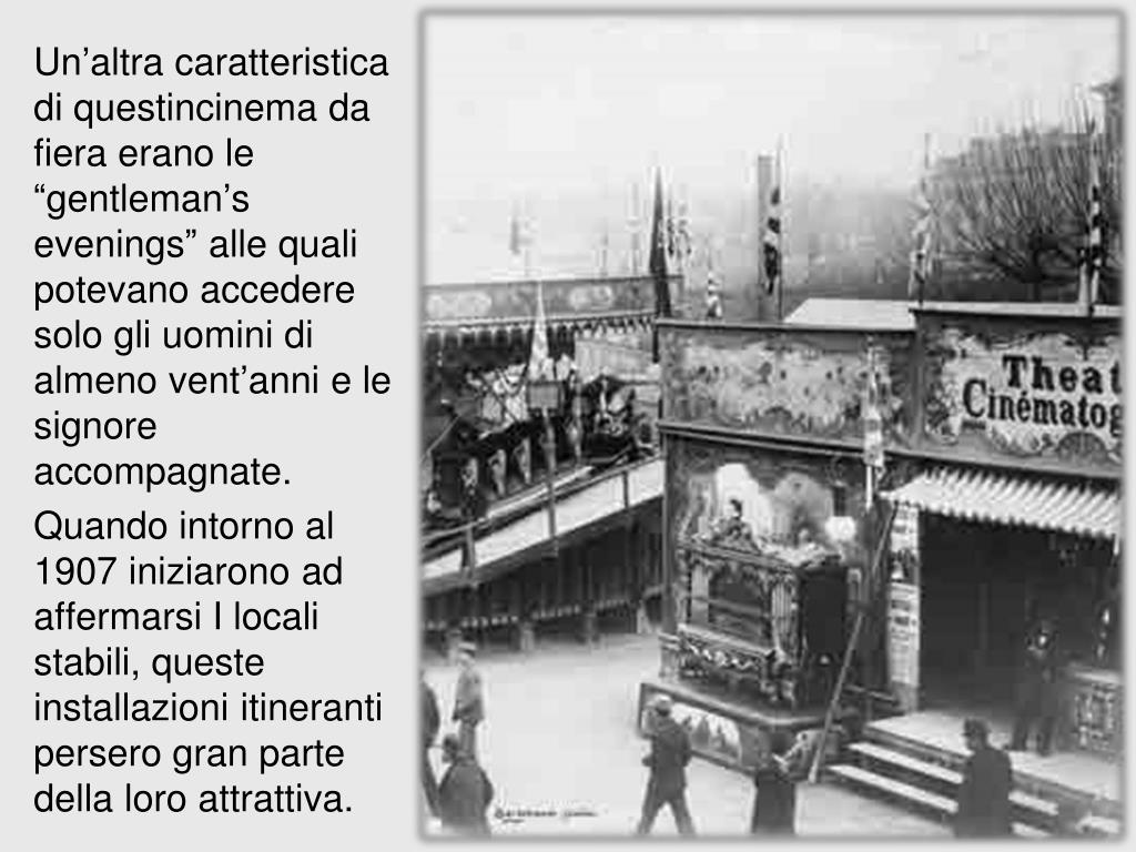 Un’altra caratteristica di questincinema da fiera erano le “gentleman’s evenings” alle quali potevano accedere solo gli uomini di almeno vent’anni e le signore accompagnate. • Quando intorno al 1907 iniziarono ad affermarsi I locali stabili, queste installazioni itineranti persero gran parte della loro attrattiva.